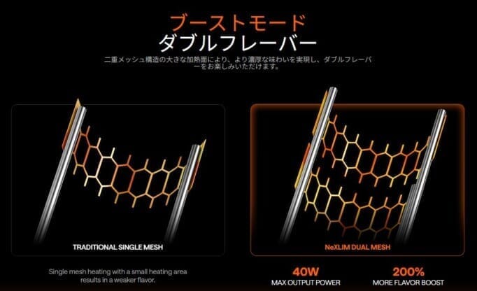 BOOSTモードはデュアルメッシュを同時に加熱して濃いフレーバーを味わえ、