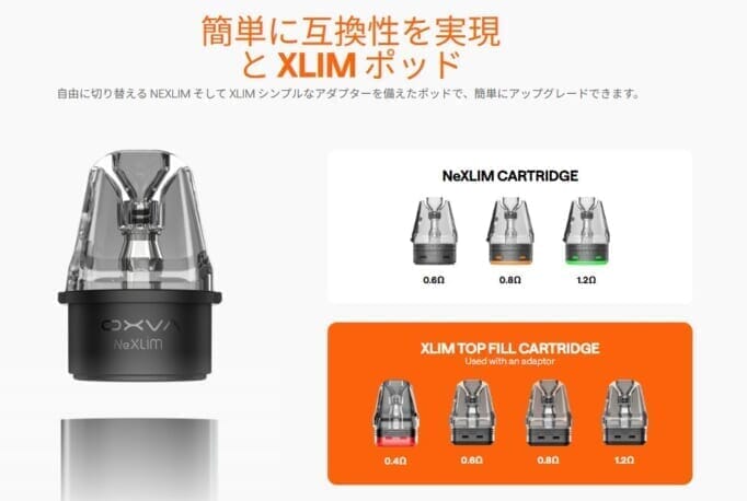 | コイル | NeXLIM カートリッジ 0.6Ω/0.8Ω/1.2Ω (アダプターにて対応)XLIMシリーズ全般 |