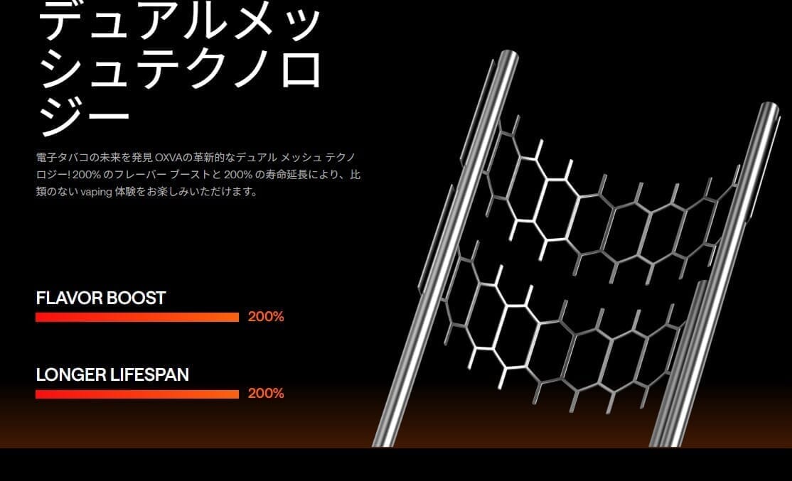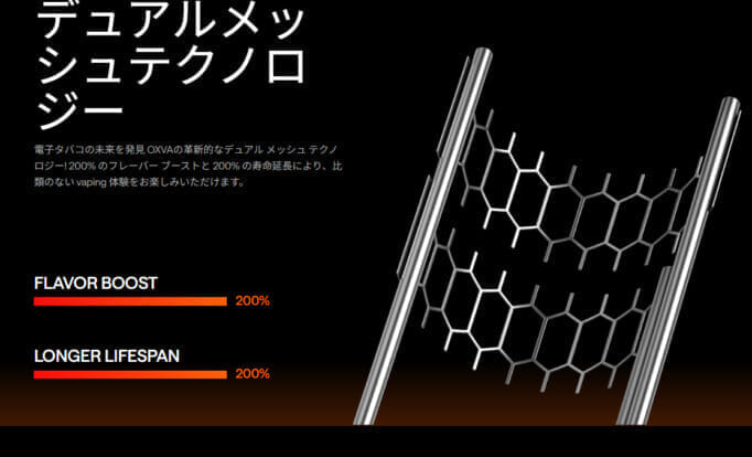 新開発のNeXLIMカートリッジはデュアルメッシュ構造になっており、フレーバーの再現度やコイル寿命が大幅に伸びているとのことです。