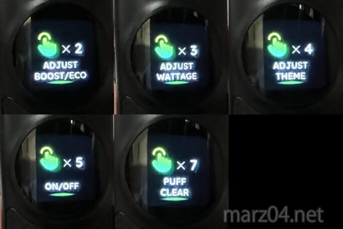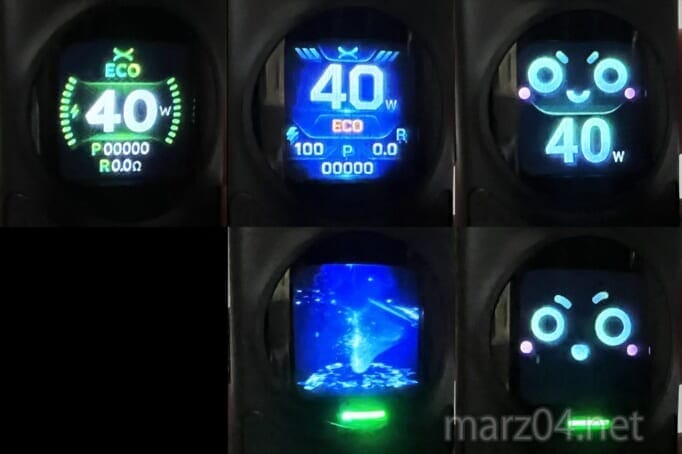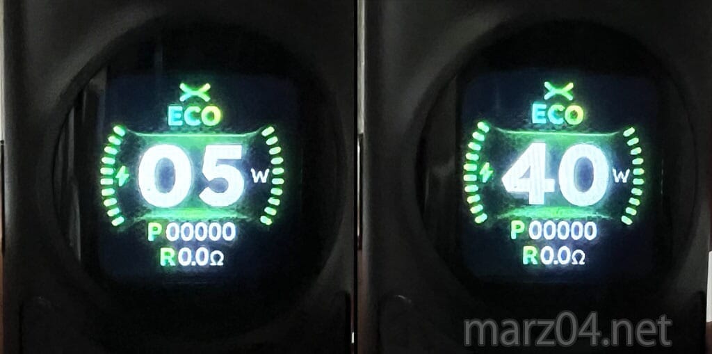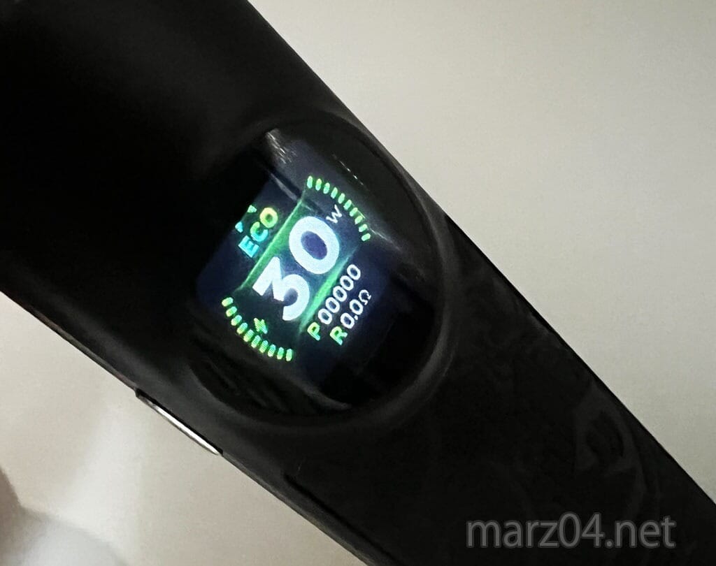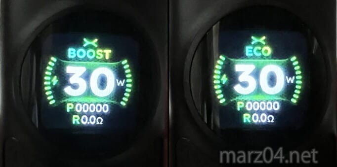 0.8ΩカートリッジだとBOOSTモード30w/ECOモード16wでした。