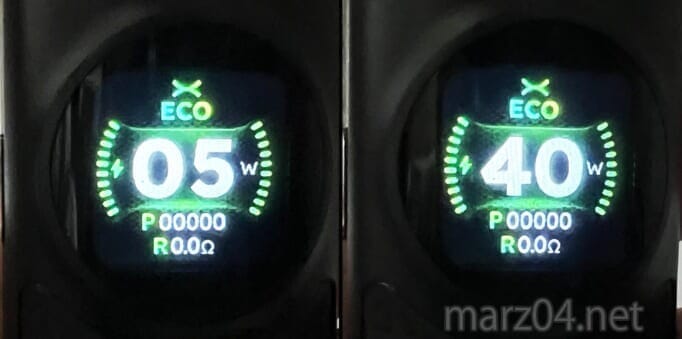 0.6Ωカートリッジを装着すると、BOOSTモードで38w、ECOモードで22wに自動調整されます。