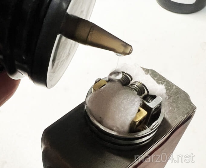 ここでアトマイザーのコットンを交換し、まっさらな新しいボトルを用意して5滴添加、