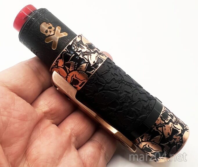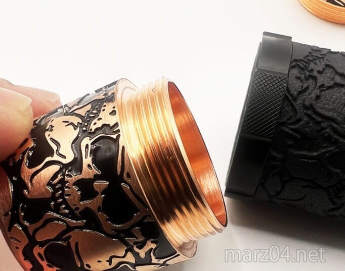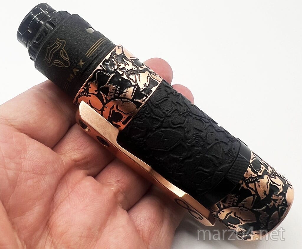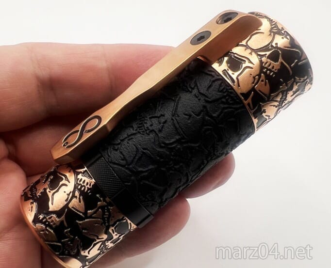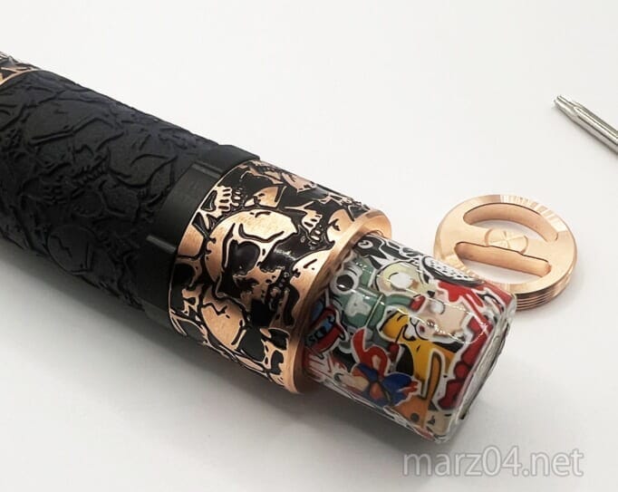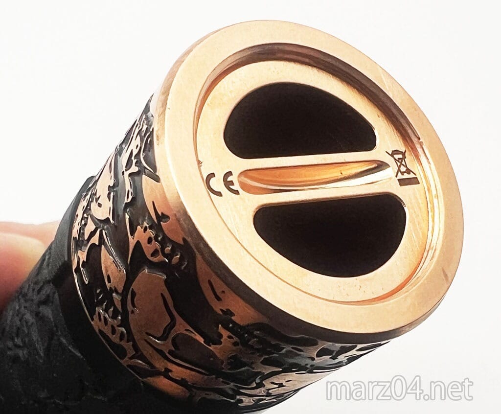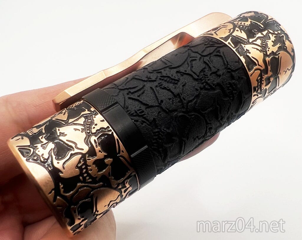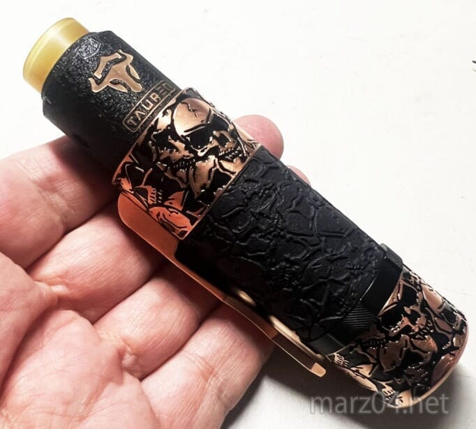 基板やコンタクトを介さないハイブリッド式のメカニカルModなので、18650/21700バッテリーに対応しながらかなりコンパクトな本体、ポケットクリップを兼ねたファイアスイッチ、そして美麗なエングレービングと精巧な作りが特徴です。