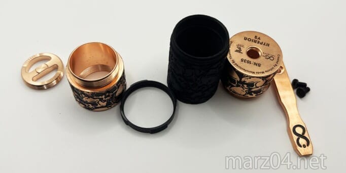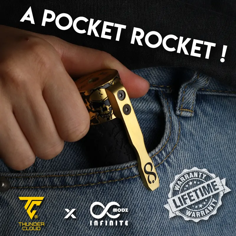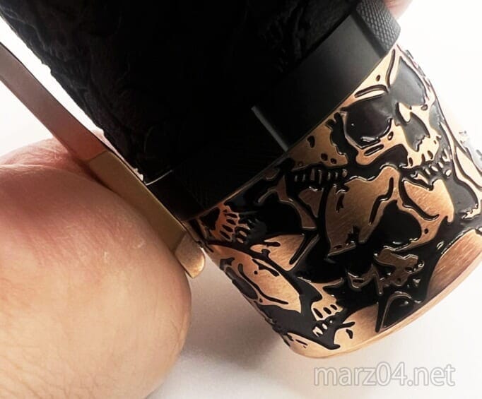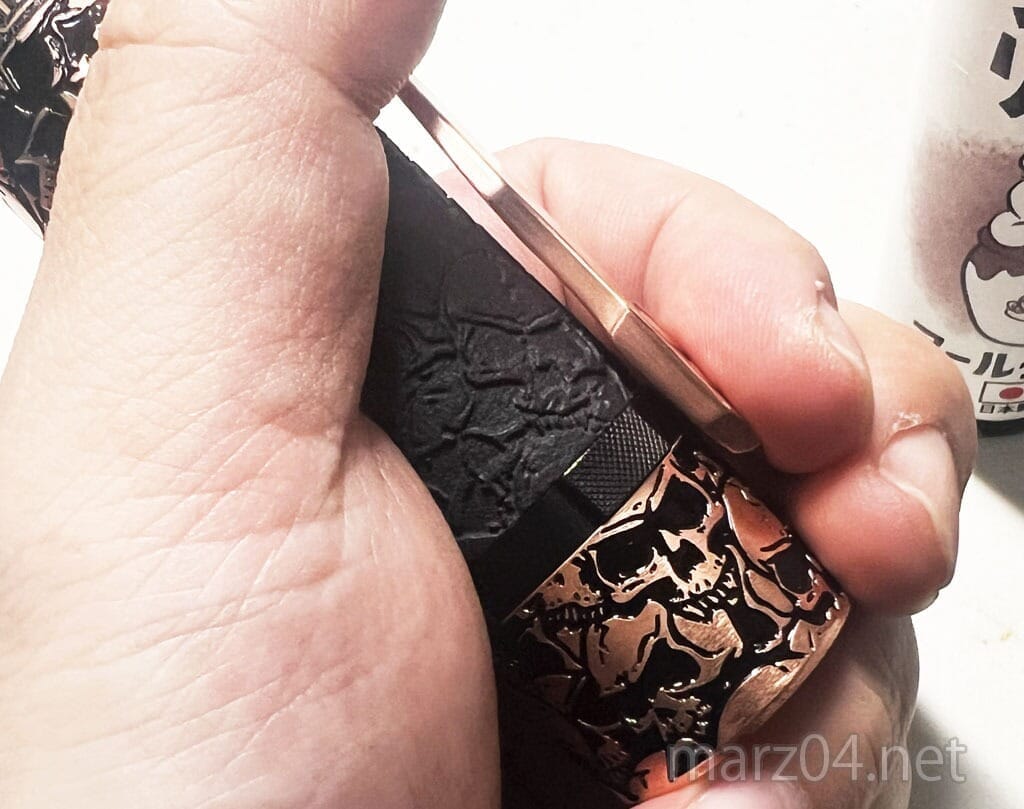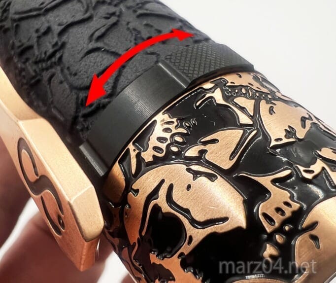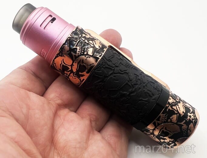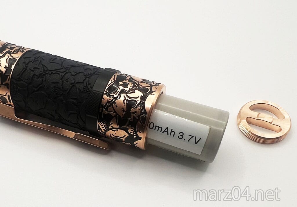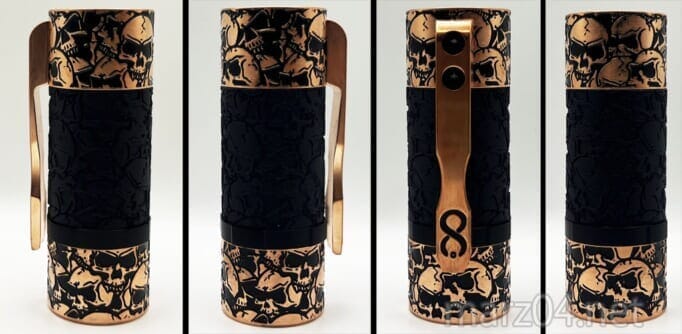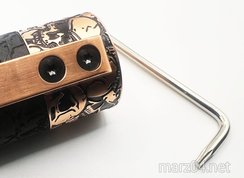 基板やコンタクトを介さないハイブリッド式のメカニカルModなので、18650/21700バッテリーに対応しながらかなりコンパクトな本体、ポケットクリップを兼ねたファイアスイッチ、そして美麗なエングレービングと精巧な作りが特徴です。