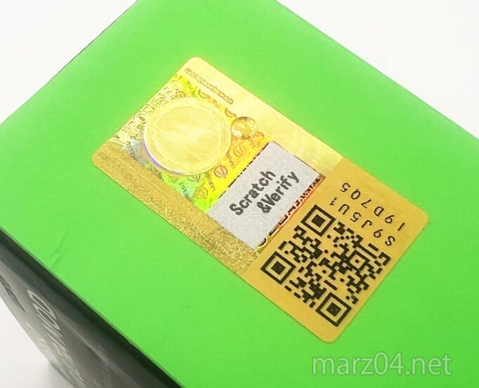 側面には正規品チェック用のスクラッチシールが貼られています。