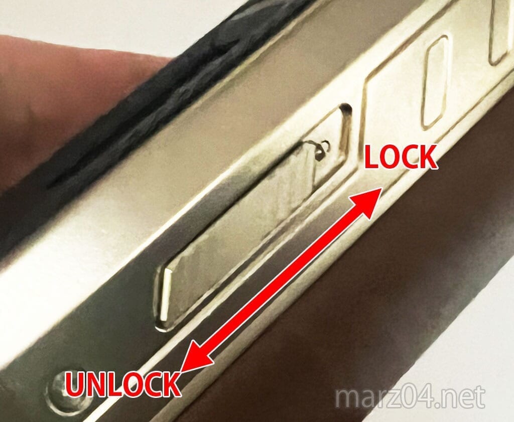 サイドにあるスライドスイッチにて簡単にロックを切り替えることが出来ます。