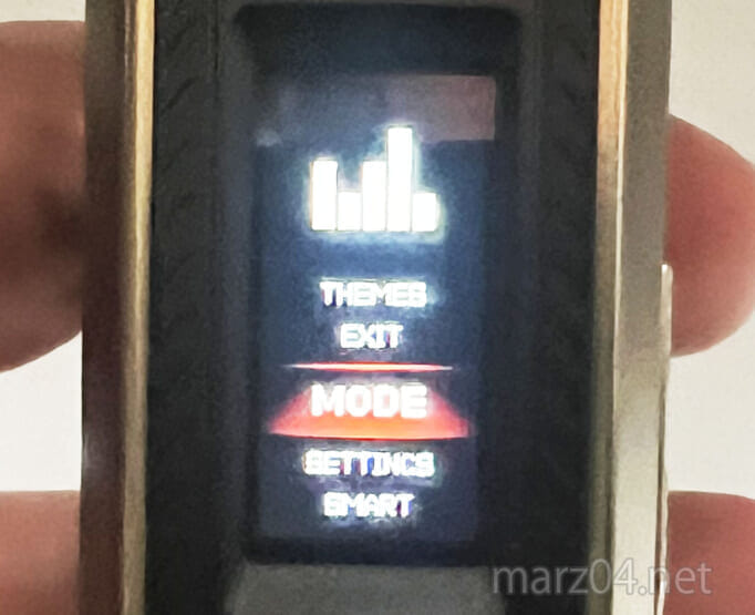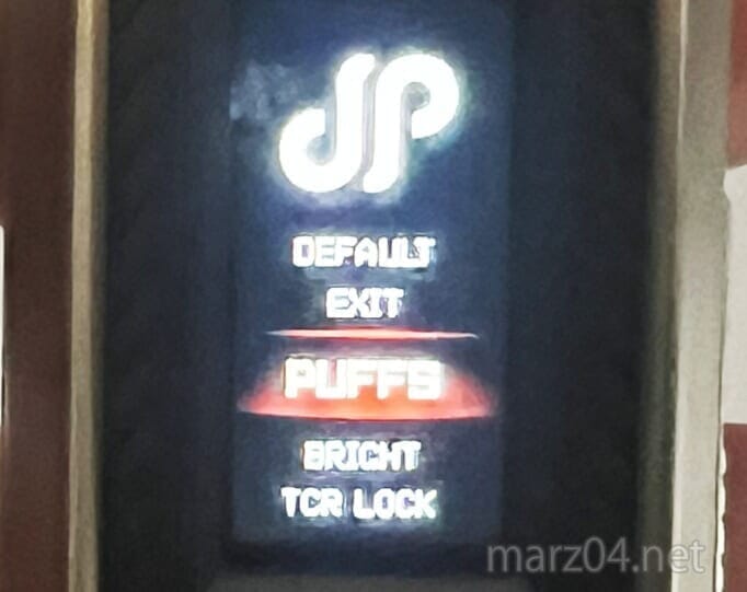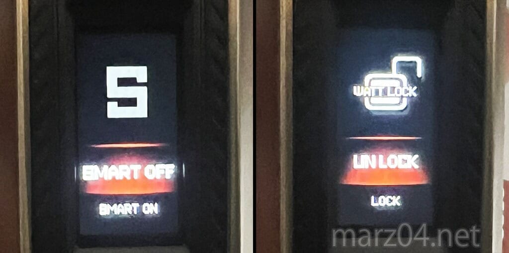 「SMART」は、コイル抵抗値に応じて自動でワッテージを調整するSMART機能のON/OFF