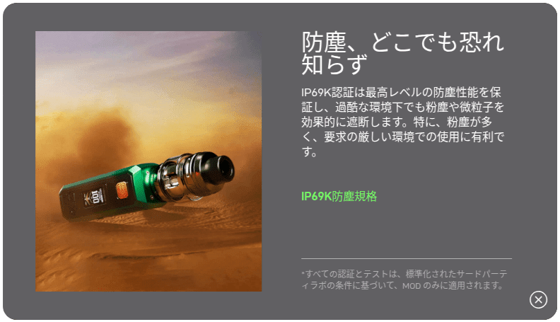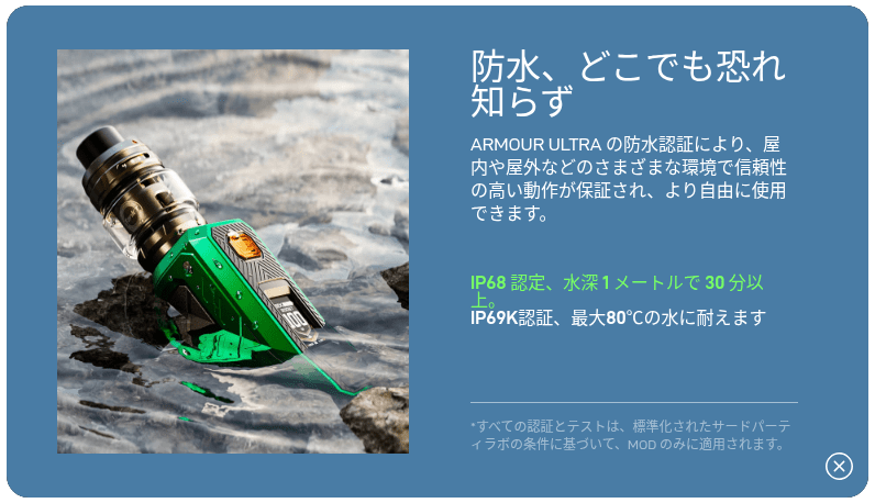 防水・防塵・耐衝撃のスペックがすごいですが、流石にVAPEでそこまでの性能を要求されることは稀でしょう、