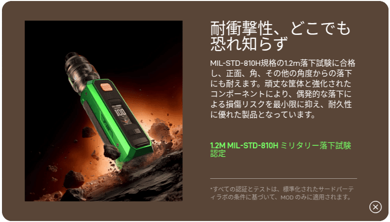 1.2mの落下試験とありますが、最新の規格は5フィート(約152cm)に引き上げられている模様、とはいえVAPE製品としては充分すぎるほど強いことには違いありません。